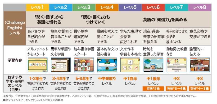 レベル4以上で中学生先取り、レベル6で中学1年終了レベル(英検®5級)ということで、どんどん上を目指せるのは英語好きになるきっかけにもなりそう。