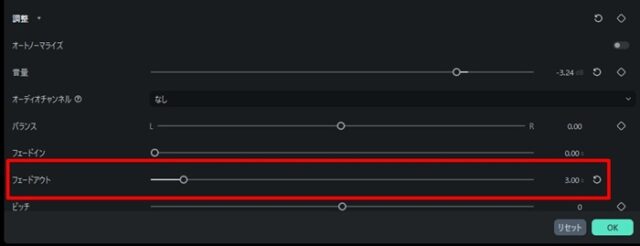 フェードアウトを右に動かすだけでOK。時間も指定できます。