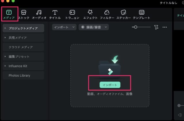 メディアが開かれているのを確認し、インポートをクリック、もしくは画像をドラッグ&ドロップして画像を入れます。