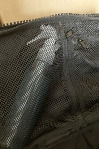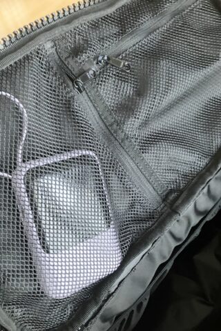 上蓋の裏にはメッシュのポケットが2か所。モバイルバッテリーなどもしもの時のものが入るのが嬉しいですね。