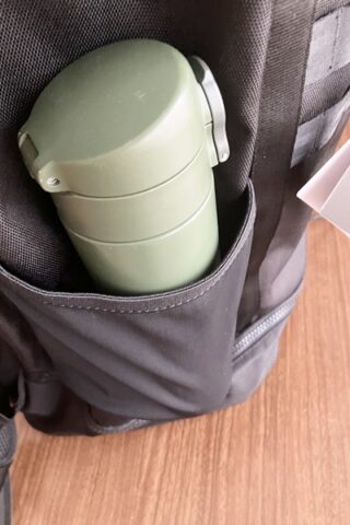 サイドには両方ポケットがついていて500mlのペットボトルは余裕で入ります。いつも使ってる水筒を入れてみるとちょっと背が高いからか油断したら落ちる...かも?