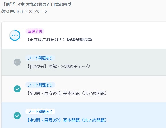 理社に関しては学校からのワークのみ。定期テスト前にスタサプの演習をして間違っている所は動画を見るという形で英数とは違う勉強方法を取りました。