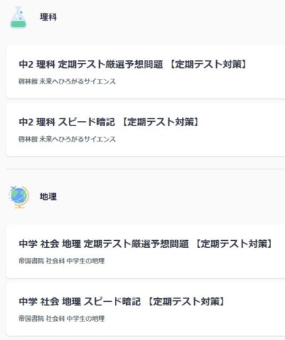 理社は定期テスト対策講座を見ています。定期テスト対策用の厳選問題があるので学校のワークが終わったら厳選問題をさせるようにしました。