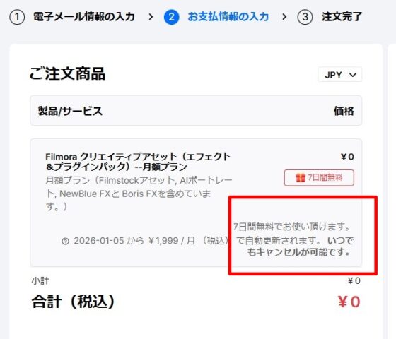 Filmoraのお試し無料体験の際にクリエイティブアセットの契約にチェックをしておけば、同じように7日間使う事が可能。