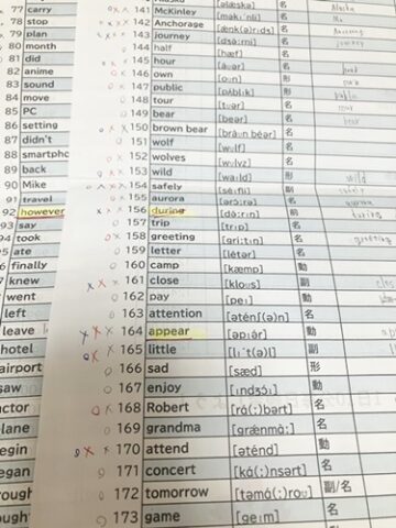 写真は1学期の単語かな?こんな感じで200~300語の単語が出ます。よく頑張った!!