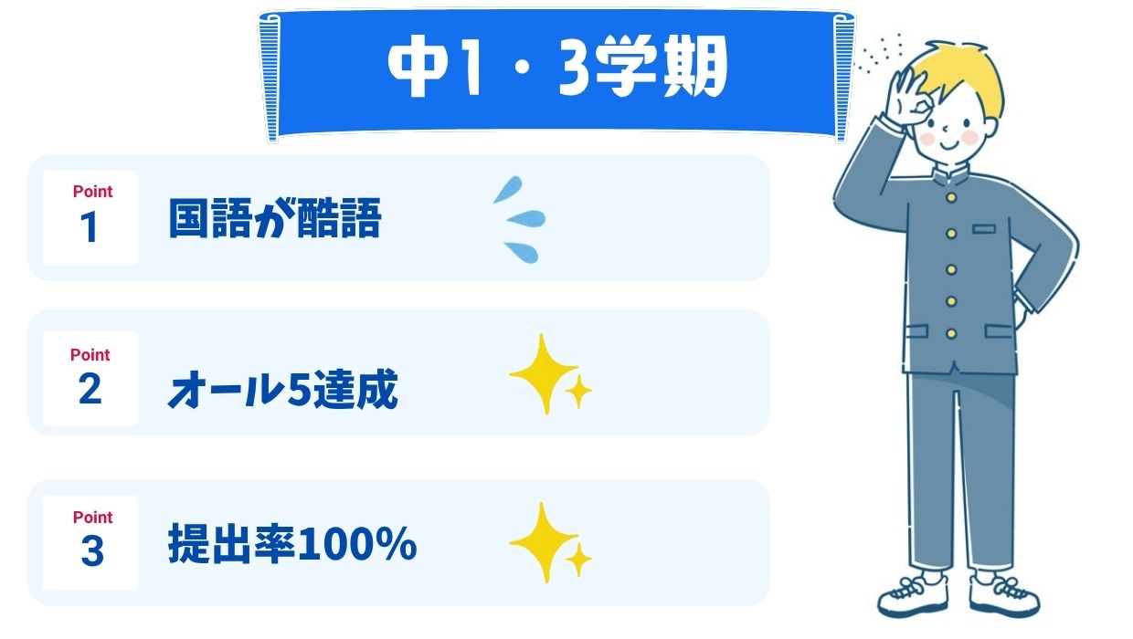 中1・3学期は、順位や実力テストの結果に悔しさが残る一方で、通知表は満点。