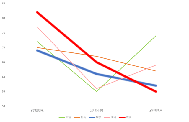 平均点60点前後を目標に作られているので、60点を切ってしまった教科の先生って修正かけてるのかな?と思う程期末で上がったのですが、安定的に下がっている「英語・数学」。