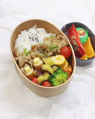 さっぱり味の豚肉ネギ塩焼きをメインに、卵焼きやさつまいも煮、にんじんたらこなど彩り豊かな副菜を詰めたお弁当です。