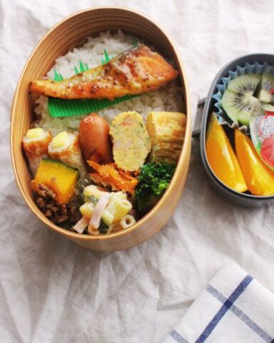 副菜には、かぼちゃのそぼろ煮やカニカマ卵焼き、マカロニサラダなど、栄養も彩りもばっちり揃えました。