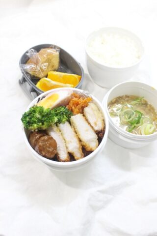 • スープ容器に汁ごと入れるので、ご飯がふやけず、お昼に「熱々のカツ丼」が完成
