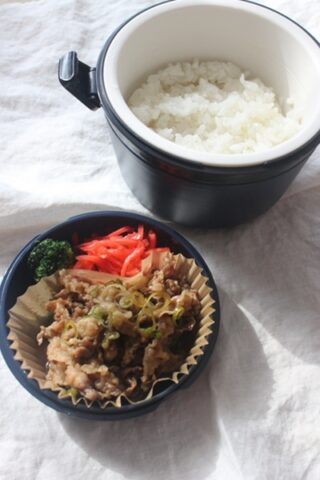 あっという間に出来る牛丼は丼タイプの保温弁当に牛丼の具と紅ショウガを入れるだけで出来るので超らくちん。時間がない日こそ作ってみて♪