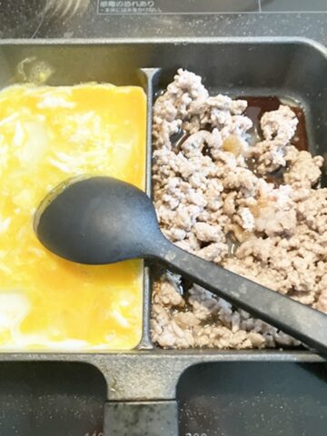 • ひき肉に砂糖・醤油・酒を入れてセパレートフライパンで卵・ひき肉を炒めるだけ
