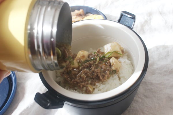 我が家の保温弁当箱の丼タイプは保温効力が高くないので、麻婆豆腐はスープジャーにいれてかけてもらう方式。