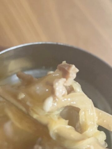 • 市販のめんつゆを薄めて、新タマネギとカツを煮るだけ