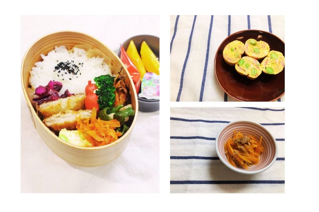 豚肉しょうが焼き用を重ねて作ったミルフィーユカツは、火の通りも良くて食べやすく、お弁当メインにぴったり。副菜にはにんじんツナ煮やカニカマと枝豆の卵焼き、ピーマンと豚肉のオイスター炒めなど、野菜をたっぷり使った彩り豊かな組み合わせ。前日のかき揚げも活かして、ウインナーやしば漬けで味の変化をつけた満足感たっぷりの一日です。 ミルフィーユカツ にんじんツナ煮 枝豆卵焼き 献立一覧 (メイン)ミルフィーユカツ (副菜①)にんじんツナ煮 (副菜②)カニカマと枝豆の卵焼き (副菜③)ピーマンと豚肉のオイスターソース炒 ...