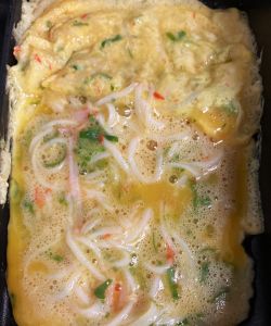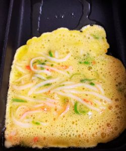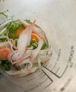 - 卵を割り、裂いたカニカマと青ネギ、【A】を入れて混ぜる