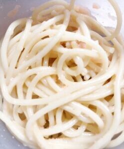 - パスタを入れ麺つゆを垂らせばできあがり(熱々のパスタを入れるのでバターは溶けます!)
