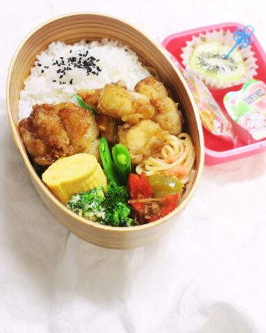 お弁当の定番・からあげを、彩り豊かな副菜と一緒に詰め込んだカフェ風献立。