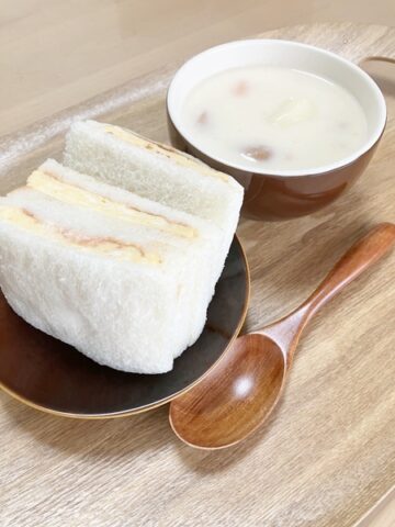 前日残ったシチューとサンドイッチ。この日は卵を潰すのも面倒だったので(笑)厚焼き玉子を挟みました。