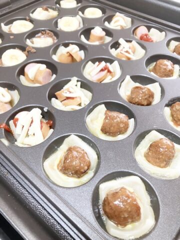 冷凍パイシートを四角に切ってホットプレートに。その後好きな具材を入れてパイがカリっとするまで焼けば出来上がりの子どもも楽しめる一口パイ