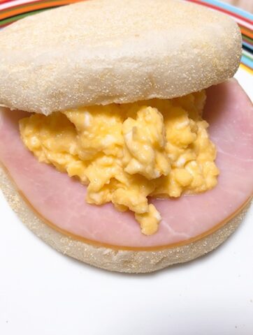 イングリッシュマフィンを使えば好きなものをサンドするだけ。チーズ嫌いの娘用にハムと卵。