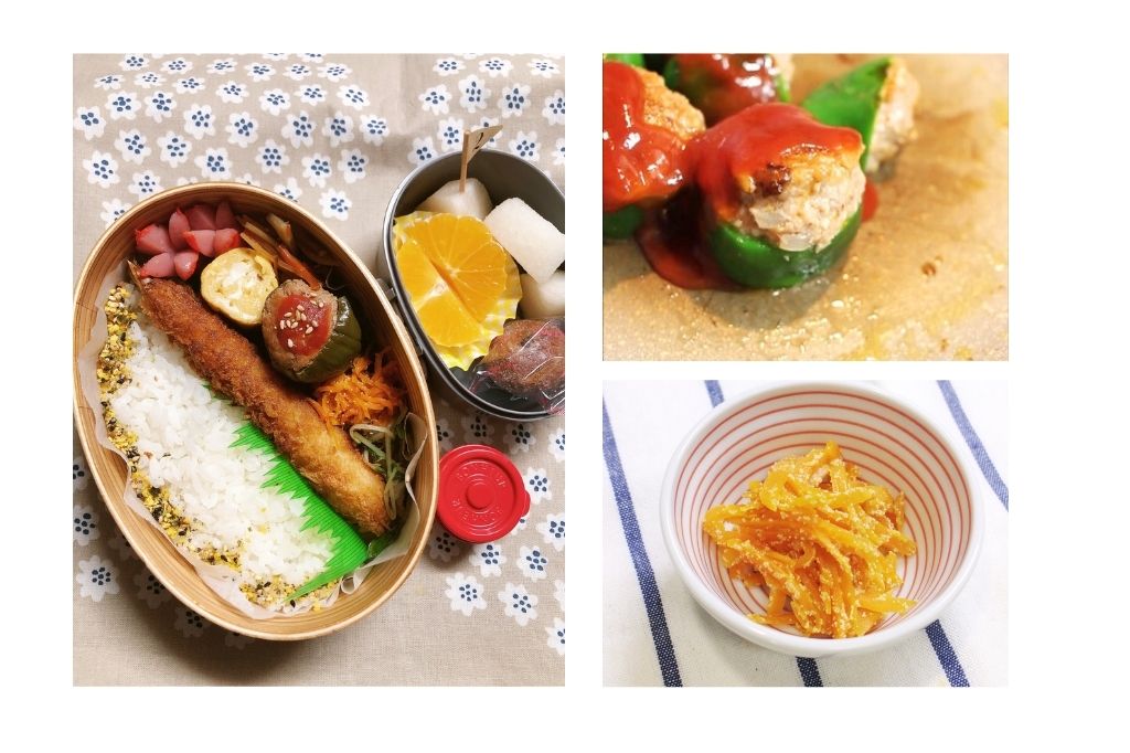ピーマン豚こま肉詰め 海苔卵焼き にんじんツナ煮 献立一覧 (メイン)ピーマン肉詰め (サイド①)にんじんツナ煮 (サイド②)海苔卵焼き (サイド③)高菜炒め ウインナー トマト チーズちくわ オレンジ ゼリー アルフォート レシピ メイン サイド① サイド② サイド③ その他お肉の献立 おすすめレシピ