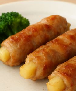 細切りにしたじゃがいもをレンチンして、豚肉でくるっと巻いて焼くだけ。