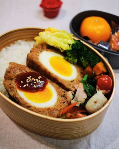 見た目も華やかでボリューム満点な「スコッチエッグ弁当」です。メインのスコッチエッグは、半分にカットすると黄身が顔を出してお弁当がぐっと豪華に!副菜には、かぼちゃ塩昆布やちくわの照り焼き、ほうれん草とベーコンのソテーなどを合わせ、彩りと栄養も意識しました。ご飯が進むおかずがたっぷり入った、満足感のあるお弁当献立です。 スコッチエッグ かぼちゃ塩昆布 ちくわ照り焼き 献立一覧 (メイン)スコッチエッグ (副菜①)かぼちゃ塩昆布 (副菜②)ちくわ照り焼き (副菜③)にんじんとピーマンのきんぴら (副菜④)ほうれ ...