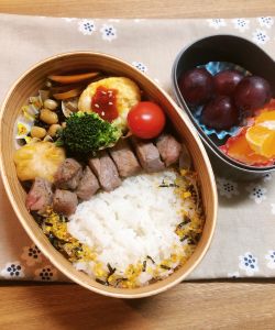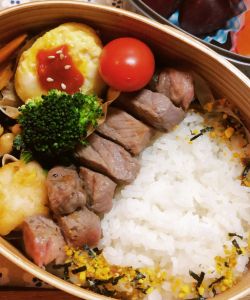 夕食の定番ステーキを、お弁当用にアレンジ。細かく切って食べやすくし、玉ねぎをすりおろして作る自家製ソースでしっかり味付けしました。