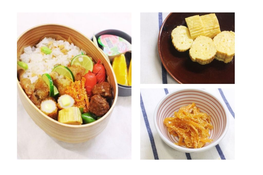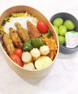 クレイジーソルトで味付けした鶏からあげに、いただきもののすだちをスライスして添えた、香りまで楽しめるメインおかず。鮭フレークと枝豆を混ぜた彩りごはんを合わせた、香りまで楽しめるお弁当です。副菜にはピーマンソテー・にんじんたらこ・卵焼きなど、彩りと食感のバランスが良い組み合わせ。ちくわチーズやウインナーで食べやすさをプラスし、ブロッコリー・トマトで緑と赤の彩りも整えました。季節の香りが漂うお弁当です。 からあげ ピーマンソテー にんじんたらこ 献立一覧 (メイン)からあげ (副菜①)ピーマンソテー (副菜② ...