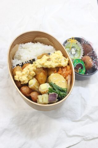 副菜には、定番の卵焼き・にんじんたらこ・ほうれん草のおひたしに加え、砂糖と塩だけで味付けしたシンプルな「さつまいもの煮物」を詰めました。