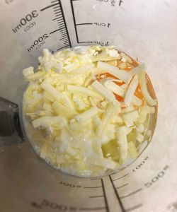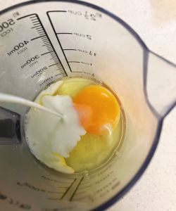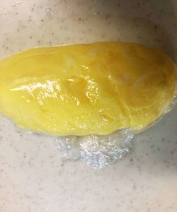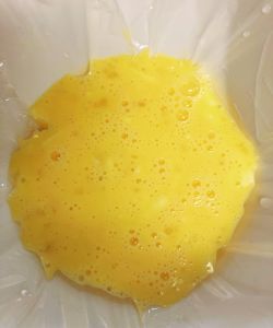 - 深めの耐熱容器にラップを敷き、1⃣を半分入れる