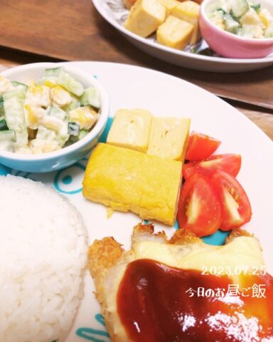 トンカツにチーズをのせてトースターで焼くだけ。手抜きでも子どもウケは抜群です。あとは卵焼きとサラダだけ(笑)