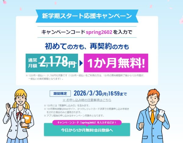 \キャンペーンコード【spring2602】で1か月無料体験中/